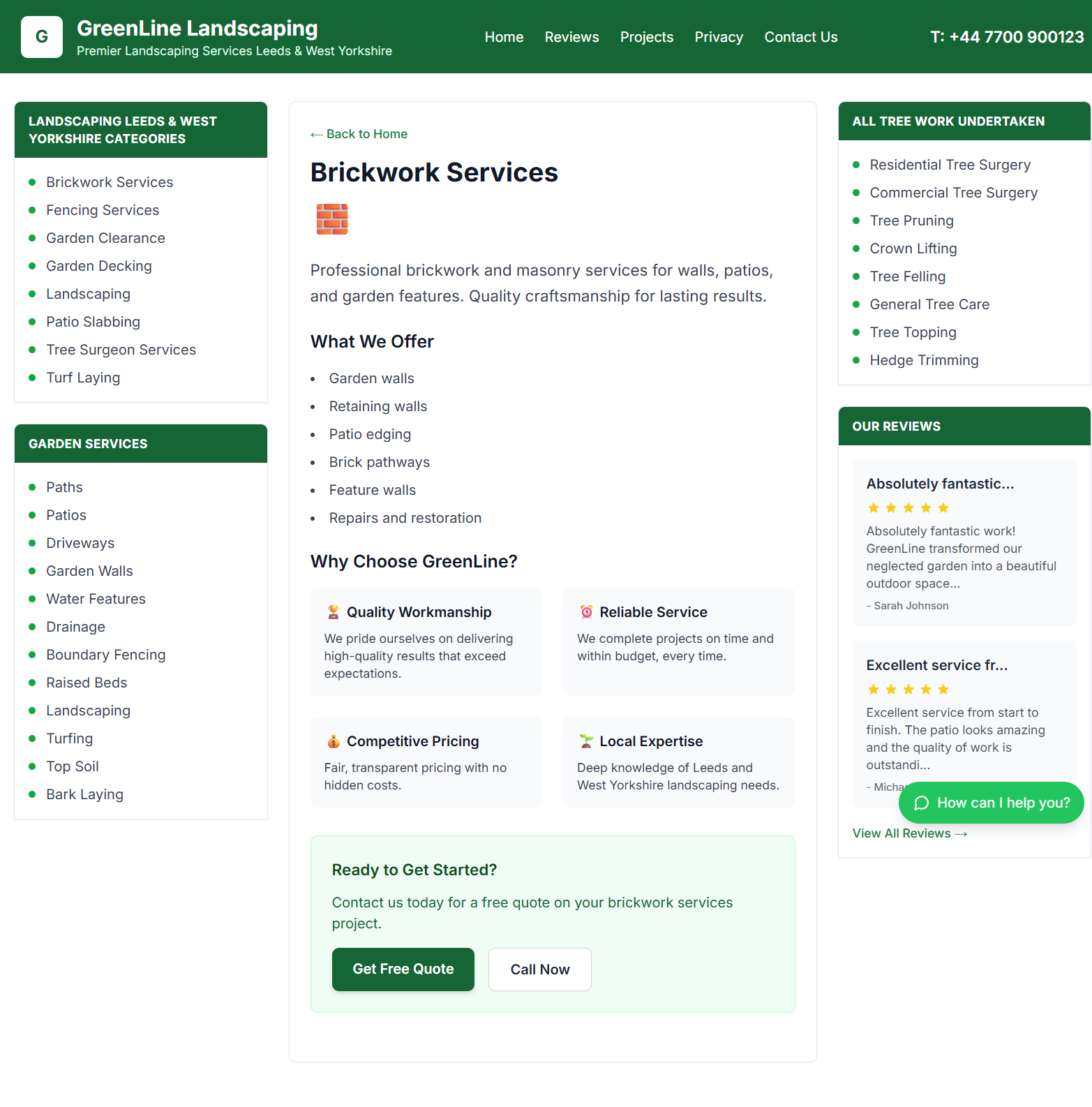 Professional landscaping business website for GreenLine Landscaping, a local Leeds-based company specializing in garden design, lawn maintenance, and outdoor landscaping services.
